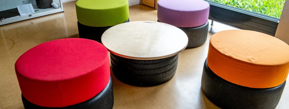 Sep.2018 Eine Schülerfirma des Gymnasiums entwickelte Sitzmöbel aus alten Rennreifen. Der Förderverein finanzierte die Anschaffung einer Sitzgruppe der Schülerfirma „enTIREly“.